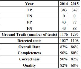Based on Table 2, it can be seen that the Overall Rate (detection rate) values obtained by the suggested approach for years 2014 and 2015 were equivalent to 87% and 86% respectively. If it is presumed that each tent is averagely occupied by three people, it can be guessed that for the first date approximately 3081 people occupied the site. In the second period, 3324 people occupied the site. In other words, there was approximately 7.3% expansion in the number of occupants that could be estimated with the proposed approach. By making the same calculations using the ground truth values, the expansion rate was about 9.2%.