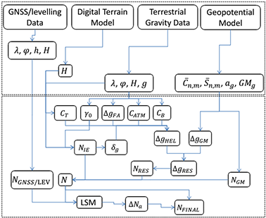 Figure 1 shows the flowchart of computations used to estimate the local geoid model according to equations presented to implement the RCR technique and to adapt the geoid height. The flowchart includes a whole set of routines developed for reading the input data, for computation procedures and results generation. All routines, here called GRAVTool, were implemented based on the MATLAB® software.