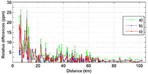 The Table 3 and Figure 10 shown that NGrav has better results than the otter models, with maximum, average and root-mean-square deviation values of relative differences of 22.561 ppm, 1.985 ppm and 3.428 ppm, respectively. The maximum relative difference values are presents until 13 km of baselines for NGrav and NFinal . (Figure 10). After this, the relative difference values are less than 10 ppm.