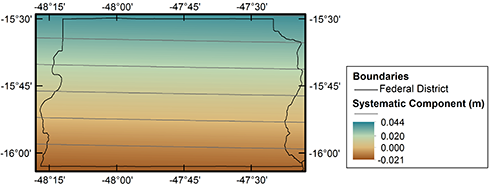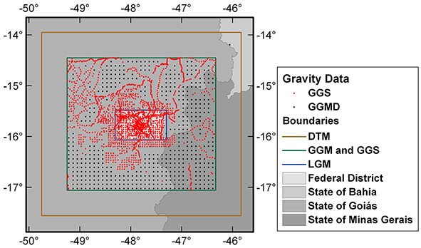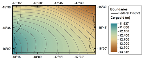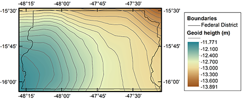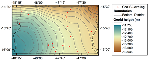 The region of the Federal District of Brazil was chosen to compute the local geoid model (LGM). This region is located between 48.25ºW and 47.33ºW and 16.06ºS and 15.45ºS (Figure 2), with a slightly wavy relief, ranging from 600 to 1340 meters above sea level.