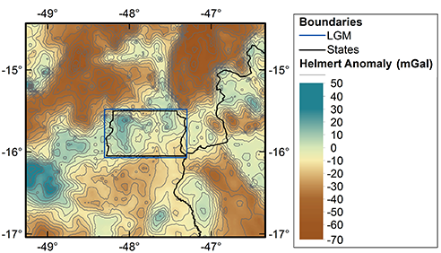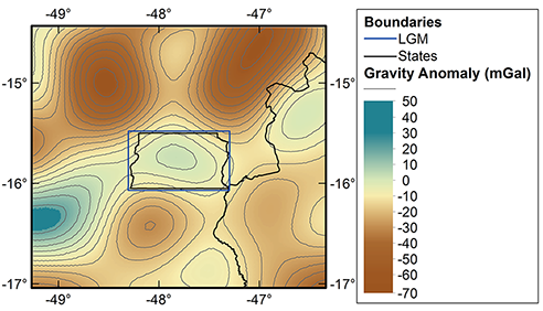 - 2312 ground gravity stations (GGS) provided by the Brazilian Institute of Geography and Statistics - IBGE, the National Petroleum Agency - ANP, including 323 new stations acquired by the authors. In addition, to complete the ground gravity data in regions without ground gravity stations, GECO up to degree and order 2190 was used. In this case, the ground gravity data were computed using the gravity anomaly and the height data extracted by ETOPO1 model, provided by National Oceanic and Atmospheric Administration - NOAA. All of the gravity data are located between 49.25ºW and 46.33ºW and 17.06ºS and 14.45ºS (Figure 2).