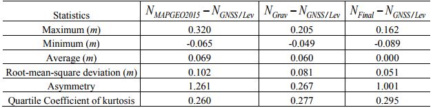 Table 2 and Figure 9 shown the descriptive statistics of the absolute differences between the geoid heights of the local geoid models and the geoid heights computed from the 24 GNSS/levelling points (Equation 41). It can be seen that the Quartile Coefficient of kurtosis is similar for all the models, but the NGrav (Figure 6) and NFinal (Figure 8) values have less discrepancy and greater accuracy than the NMAPGEO2015 values. Furthermore, the NGrav presented more symmetric than the other models and the discrepancies of the differences (maximum-minimumdifferences) of the NGrav (0.254 m) and NFinal (0.251 m) are similar.