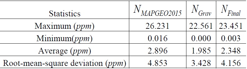 In addition to the compatibility, the calculated root-mean-square-deviation of the geoid height is near to the uncertainty of the geoid heights used as a reference, which suggests that the local geoid model calculated is consistent.