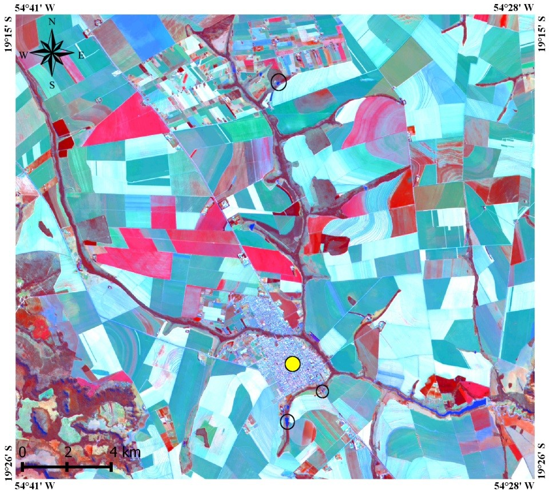 The smallest analyzed area was located near highway BR-163 and the municipality, in a region lacking wetlands and with low vegetation around the water body (Figure 4). Pixel mixture in this area was less frequent than in the other water bodies of the study.