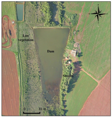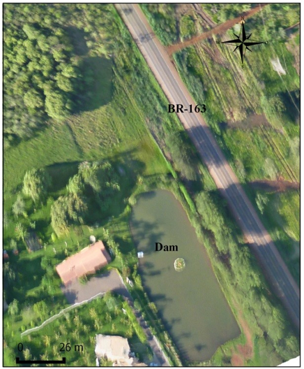The first water body is linked to an affluent of the Coxim River. It was the largest water body analyzed, and according to estimates from images acquired by UAV (16-cm spatial resolution), it occupied a surface area of 41,112 m². It has low vegetation and sparse shrubs on its margins (Figure 2).