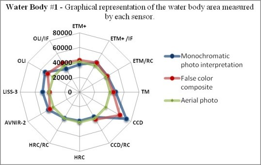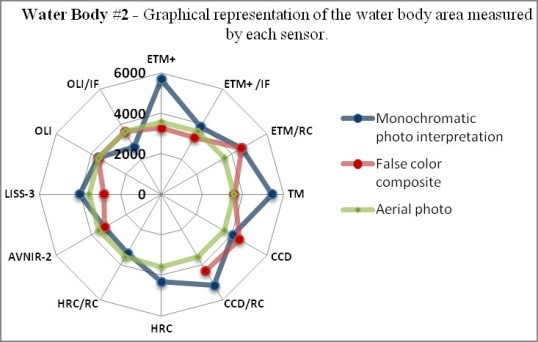 With visual interpretation, the human operator is responsible for identifying these limits to identify and analyze the characteristics of each sensor. Measuring the surface area of water bodies in different sensors helps us understand and better identify the characteristics of each sensor.