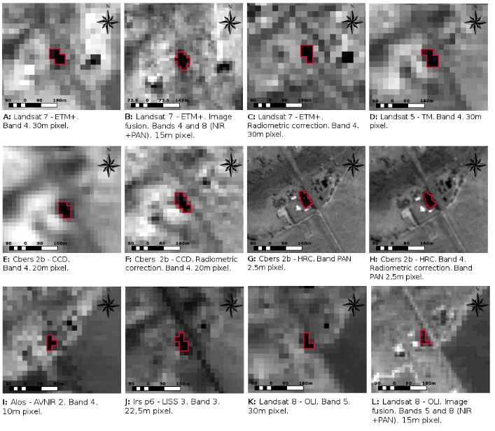 The oldest image used was acquired by the Landsat 7 satellite and retrieved from the Global Land Cover Facility (GLCF n.d.) database, whereas the most recent is from Landsat-8 (United State Geological Survey 2012). Some of the sensors used in this study are currently inactive, and others started operating recently, which hinders the acquisition of images from the same year. With the exception of CBERS-2B images, the selected images were limited to the dry season (July to September) to maintain the study’s reliability.