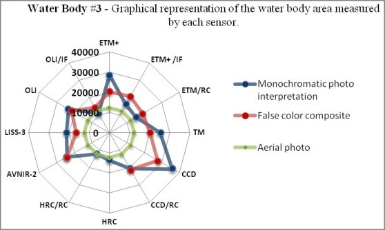 Fused OLI images presented the best results of the color composite images, and also had good precision in monochromatic analysis. The HRC sensor with radiometric correction had the best overall output, measuring an estimated dam surface area of 12,369 m². Figure 7 shows a graphical data plot for water body #3.