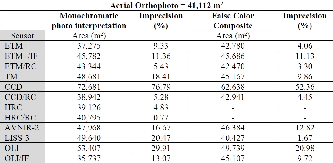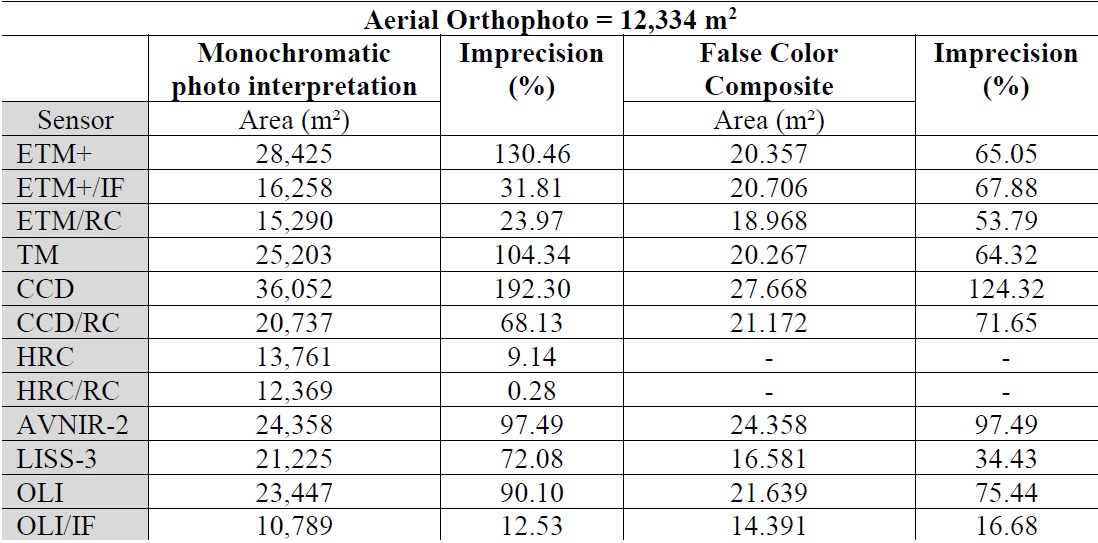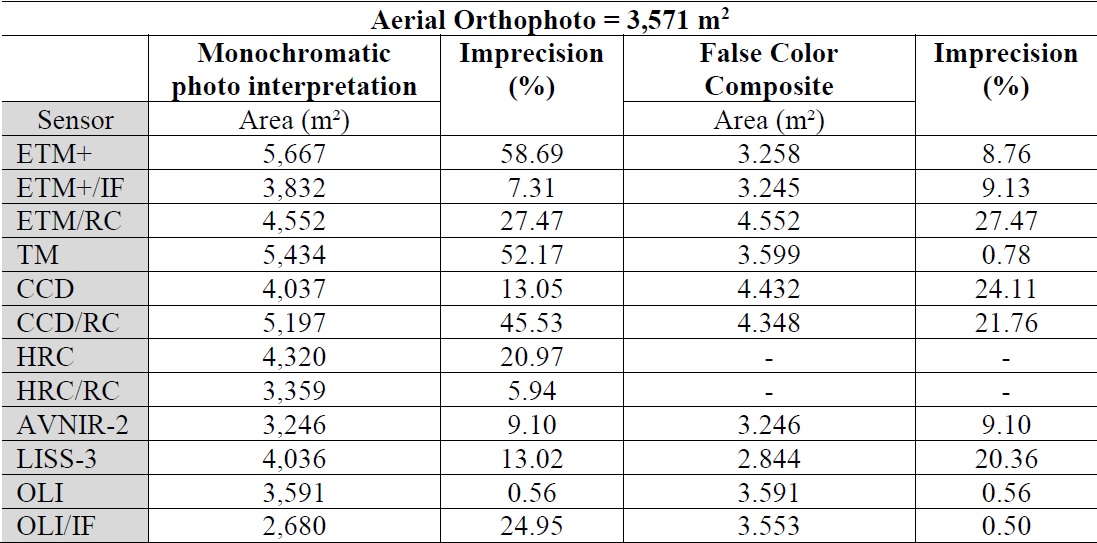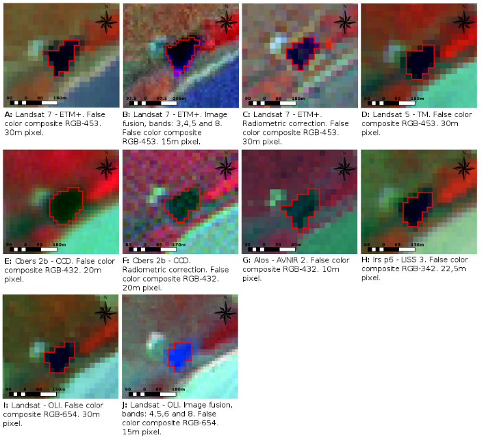 The low spectral confusion in the area makes color composite analysis more precise. The maximum imprecision in this analysis was lower than 30%, since the highest level of imprecision registered on the ETM+ sensor with spatial enhancement was 27.47%. The water body is shown in Figure 6 with images obtained from various sensors.