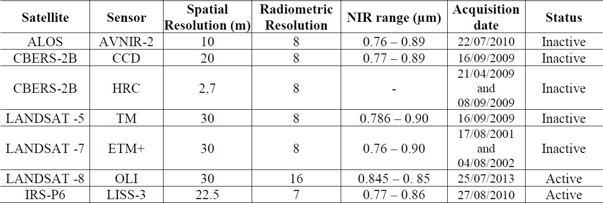 For some sensors, image radiometric correction was applied to improve the quality of the captured images to match actual conditions as closely as possible. The sensors CCD, HRC of the CBERS-2B satellite (INPE 2011a) and ETM+ of Landsat -7 were radiometrically corrected. In the case of the ETM+ sensor, images from the INPE (2011b) database were used.