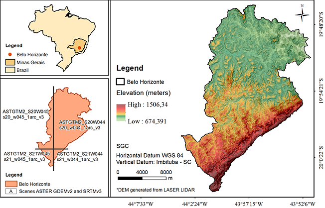 The ASTER GDEM version 2 and SRTM version 3 DEM to be evaluated were obtained from the United States Geological Survey (USGS) website. The LIDAR data used as reference were provided by the Computing and Information Company of Belo Horizonte Municipality (PRODABEL). The LIDAR survey was performed by airborne laser scanning, that provides a 25 cm vertical accuracy and an average density of 1.5 points per square meter.