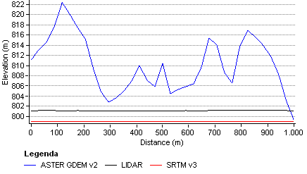 Figure 2 illustrates the above discussion, where the topographic profiles taken from de same path over the Pampulha Lagoon (starting coordinates: E = 605691.93 m, N = 7805001.28 m and ending coordinates: E = 606597.99 m; N = 7804578.14 m) show the different behavior among the three DEM. It can be seen that ASTER GDEM presented the largest discrepancies.