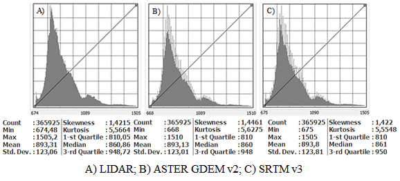 The models histogram analysis presented in Figure 3, shows the variability of elevations for the evaluated and reference data. It is observed that both elevation data do not match a normal distribution. In fact they are positively asymmetrical (positive skewness) and have similar flatness patterns (kurtosis). Presence of outliers can be observed in evaluated models comparing to the reference model. The different acquisition dates of the models data and the systemic errors associated to the acquisition process can contribute to this inconsistency. The basic statistics (maximum, minimum, mean and standard deviation) show close behavior between the three data types.