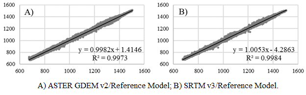 This relationship was confirmed by the simple linear regression analysis, demonstrated by means of scatter plots, in which the analysis of the determination coefficients (R2) of the regression line shows that the reference model is adequate to describe the ASTER model in 99.73% and the SRTM model in 99.84% (Figure 4).