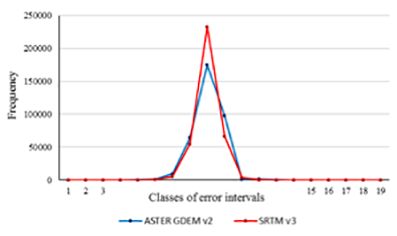 Table 2 and the Figure 5 show that class 9 grouped the smallest residuals and the highest frequencies. In the case of ASTER GDEM v2, 174,822 points out of a total 365,925, that is, 47.7% presented residuals between -4.36 m and 3.11 m. In the case of SRTM, 23,345 points out of a total 365,925, that is, 63.7% presented residuals between -4.36 m and 3.11 m. This evaluation highlights a gain of SRTM v3 over ASTER GDEM v2. Other significant percentages are located in class 8 that groups residuals between -11.83 m and -4.36 m and in class 10 that groups residuals between 3.11 m and 10.59 m. Adding the residuals of these two classes the ASTER GDEM grouped 44.44% of the residuals and the SRTM v3 33.18%.