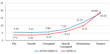The RMSE were calculated separately for each relief declivity class for both models ASTER GDEM v2 and SRTM v3. The results indicated an increase of the errors as the slope also increases (Figure 6).