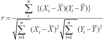 The Pearson correlation coefficient (r), given by Equation 1, is a measure of linear association between quantitative variables. The value ranges from 1 (indicating perfect positive correlation) to -1 (indicating perfect negative correlation) (Puth et al. 2014).