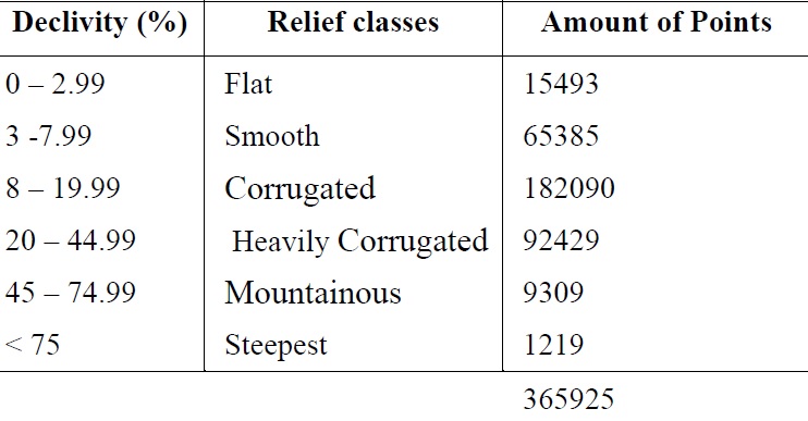 In order to analyze the influence of the terrain slope on the altimetry accuracy of the assessment models, a declivity map with 30 m pixel size was extracted from the reference DEM. The slope values were classified according to Brazilian Agricultural Research Corporation (EMBRAPA, 1979) standards, presented in Table 1.