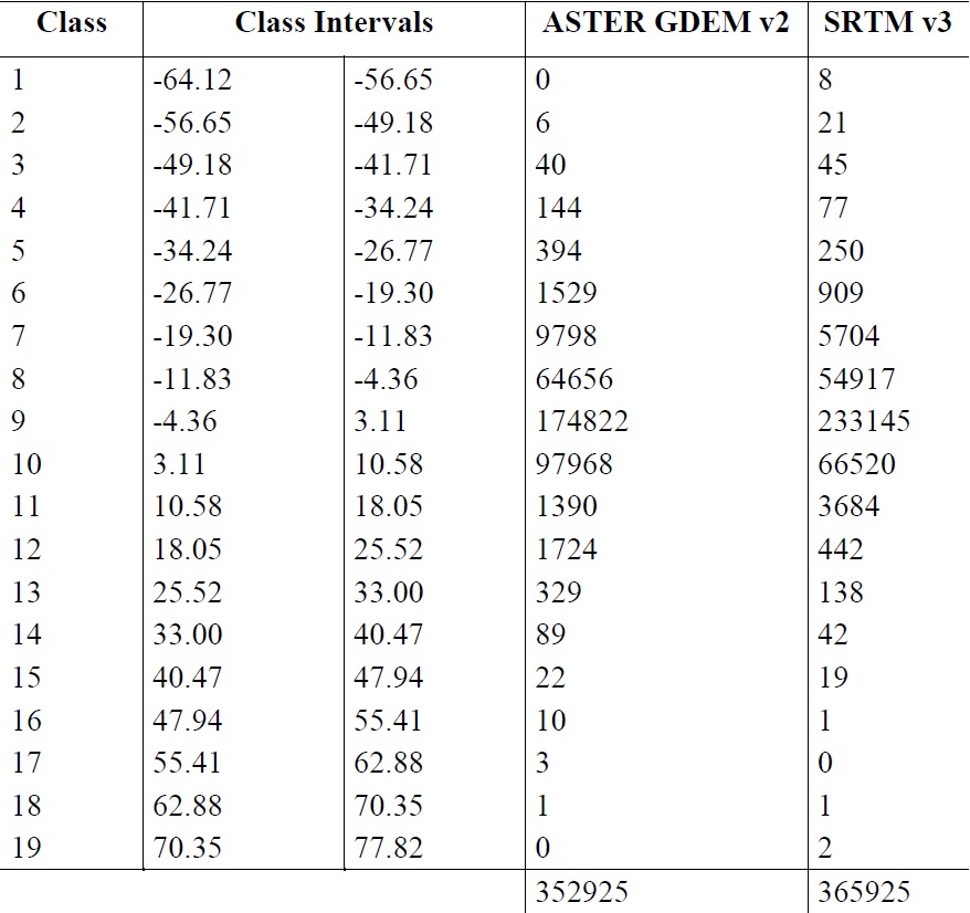 In order to evaluate whether the distribution of the reference model data and of the assessment models are statistically the same, a frequency table of the residuals found from the differences between the LASER - ASTER GDEM v2 and LASER - SRTM v3 data was built. The Sturges formulation, given by Equation 2, was applied to find the number of classes to be used.