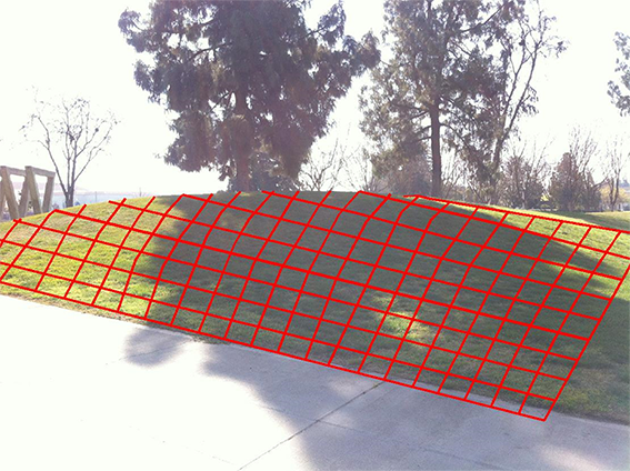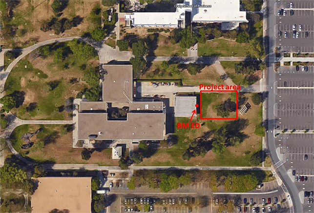 Our project area is located on the east side of the Arts Building on the CSU (California State University) Fresno campus (see Figure 1). The mound and the surrounding area were considered for this project. Therefore, a 24.688 m (81 ft) by 35.662 m (117 ft) area was staked encompassing the mound. The grid size of 0.914 m (3 ft) was chosen since generally in practice a 1 m grid size is used. As a result, 1053 points needed to be marked on the ground using stakes, flags or paint. Under the circumstances, to accelerate the process, points were located on the ground using a total station and the elevations of grid corners were surveyed utilizing differential leveling immediately after locating the point with the total station. For reference to our elevation, a local point (BM ED - see Figure 1) on the west side of the project site was established on a concrete slab with an elevation of 30.480 m (100 ft).