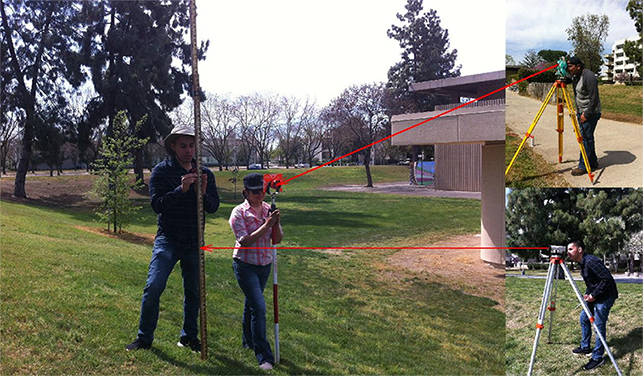 Once the perimeter of the project site was staked, a total station was set up over the stakes along the northern line and the corners which were the farthest were sighted as backsights. The instrument was then turned 90° to obtain the line of sight to lay out the grid intersections (see Figure 2). As soon as the point was located using the total station and the reflector pole, the reflector pole was removed and a leveling rod was held at the very same point for differential leveling readings (see Figure 3). For the differential leveling, BM ED was sighted as our backsight and all the grid points were sighted as site shots and the leveling circuits always closed on BM ED for checking purposes.