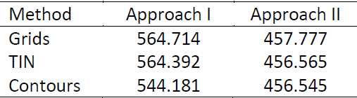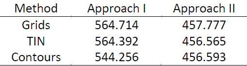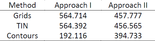 As can be seen in Table 1, the grid and TIN method results are quite close to each other; nonetheless, the contours method results are rather different. This is because with the grids method and TIN computations, the volume of the entire area of interest is calculated. On the other hand, with the contours method only the volume between the bottom and top contours are determined i.e., the areas below the lowest contour and above the highest contour are not taken into account. Generally, clients demand to know the total volume of the entire project area not just the volume between the bottom and top contours. As a consequence, better volume computations using the contours method is needed. For this purpose, authors propose to use the following formula: