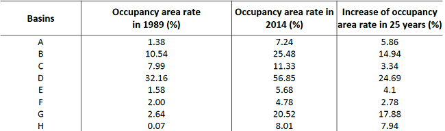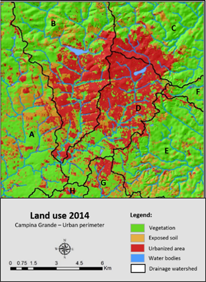 The author has taken into consideration several criteria in the analysis and final definition of the boundaries basins, including local drainage experts and visits to validation. The current study adopted the delimitation proposed by Tsuyuguchi (2015). Land use changes are quantified in Table 1. The numbers show that the basins B and D (Bodocongó Basin and Prado Basin, respectively) have demonstrated the highest occupancy rate in a 25-year observation period.