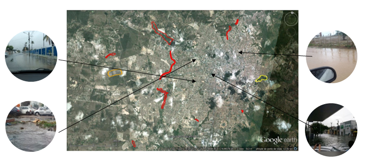 Campina Grande has been facing a severe water scarcity in its human supply, which comes from a reservoir located outside the urban area and in another river basin. Even that, it is exposed to floods during the rainy periods, mainly due to the frequency of concentrated rainy events. These events take place often (in rainfall cases) and cause flooding in the county’s neighborhoods (Figure 2). These events were also documented in the Municipal Basic Sanitation Plan (PMSB - Plano Municipal de Saneamento Básico), which was prepared from 2013 to 2015 and approved by the technical analysis team. The information in the technical report was checked in the field, through the population and data collected by the municipal government of Campina Grande (PMCG - Prefeitura Municipal de Campina Grande).