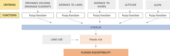 In addition to the hydrological modeling, other aspects may be explored in order to map areas most susceptible to flooding. Meyer, Scheuer and Dagmar (2009) have pointed out that, despite the vast amount of scientific studies using multicriteria analyses in their approaches, few studies apply this tool to the flood management context, although its use may produce valuable results. The multi-criteria analysis is based on mapping variables per information plane and on defining the membership degree of each information plan (valuation), as well as of each of its caption components, to find the final result (Moura, 2007).