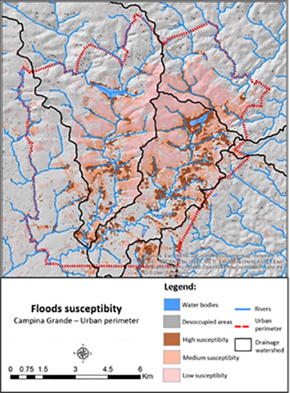 The current article has mapped the flood susceptibility of Campina Grande County (PB), through a multicriteria analysis conducted in the ArcGIS (Esri) software. The flood map shows critical points in the county according to the current land-use scenario (imperviousness), by taking into consideration criteria such as the presence of drainage elements, the distance from lakes and rivers, altitude and declivity. This type of integrated approach plays a crucial role in the management and can help cities to prevent and prepare for disasters, such as floods effectively.