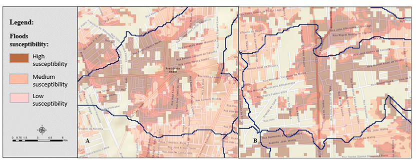 It is worth highlighting a zone showing high susceptibility to floods between two neighborhoods - Tambor and Industrial District - in Southwestern Campina Grande County (Figure 6B). This area covers a long stretch of Assis Chateaubriand Avenue, which is one of the high-traffic avenues in the region. Studies conducted by Santos (2015) and Nóbrega (2012) in the areas surrounding these neighborhoods have indicated that the entire region is highly susceptible to floods, (previous shreds of evidence). Ramalho et al. (2015) have classified the whole area as “high risk” and suggested that priority actions could avoid future floods. In addition, the districts are part of the drainage macrosystem of Prado Canal (basin D), which showed the highest imperviousness rates (Table 1); several areas in these neighborhoods were also classified as highly susceptible to flood (according to the current County Master Plan).