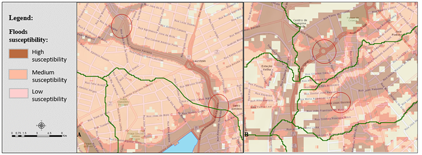 Catolé is another district belonging to Prado macro-basin (Figure 7B). This area shows high population density and already presents several issues typical to large cities such as lack of mobility and infrastructure, as well as frequent flooding in periods of more intense rains. The intersections highlighted by red circles are often flooded and become inaccessible during more intense raining events. These intersections were also classified as highly susceptible to flood in the herein performed analysis. Santos (2015) carried out an integrated land use and urban drainage analysis in Catolé and found that several lots showed more imperviousness than that allowed in the county’s current legislation. The author has also used simulations to show that the floodings in the neighborhoods could be reduced if the legislation was fulfilled.
