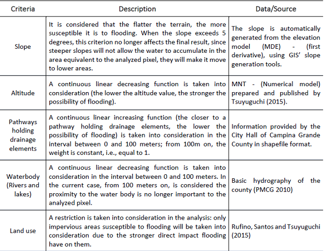 Studies already developed by other authors (Meyer, Scheuer and Dagmar 2009; Sadeck, Souza and Silva 2012; Zou et al. 2013) were taken into consideration at the time to prepare the conceptual model of susceptibility to floods (detailed in Figure 4 and Table 2) and to define the model’s criteria. Thus, given the availability of data concerning Campina Grande County, the analysis performed in the current study has set weights, which were applied pixel by pixel, based on the following premises:
