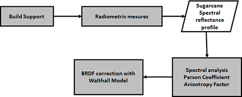 To evaluate the variations of sugarcane radiometric measurements with changes in the viewing angle, a special mounting support was built to carry out the measurements over healthy sugarcane canopy. The study on the variation of the spectral reflectance profile can support improvements in the algorithms of anisotropy correction in images acquired by the sensor. Therefore, spectral measurements in nadir and off-nadir angles were considered in the experiments. Spectral measurements were performed, and the correlation coefficient was calculated to compare the spectral reflectance profile. The anisotropy factor and anisotropy index were determined to aim at the estimation of the BRDF variability in the spectral data of sugarcane. Finally, a model to minimize the BRDF effect was applied in the spectral reflectance profile. Figure 1 shows a flowchart summarizing the steps of the methodology adopted, which are detailed in this section.