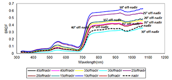 Anisotropy is a spectral property that shows whether a certain target is directionally dependent. There are models reported in the literature that consider the directional dependence of the targets and minimizes the bidirectional reflectance caused by viewing geometry (Liang 2004; Sandmeier et al. 1998). The more detailed knowledge of the anisotropy of the recorded reflectance factor of the vegetation canopy is important in the analysis and treatment of remote sensing data (Deering, Middleton and Eck 1994; Weyermann et al. 2014 Walthall et al. (1985) proposed a model to compensate the anisotropy factor in target response and minimized the effect of BRDF from vegetation based on normalized measurement in nadir.