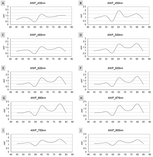 ANIF was calculated centering the spectral bands in blue (430 nm - absorption band of chlorophyll a, 450 nm and 480 nm), green (550 nm green reflection and absorption band of phycoerythrin), 620 nm, red (650 nm, 660 nm - absorption band of chlorophyll a, and 675 nm), near infrared (750 nm and 900 nm).