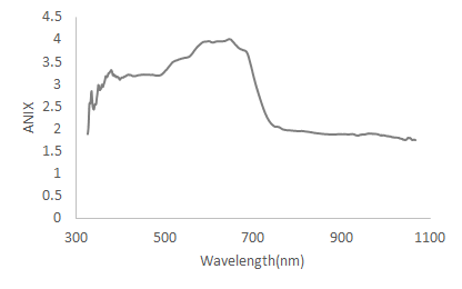 The highest values of anisotropy determined by ANIX (Figure 5) occurred in the visible region. The maximum ANIX was around 4 near the 650 nm wavelength. The values of ANIX decreased in the near infrared, becoming almost consistent.