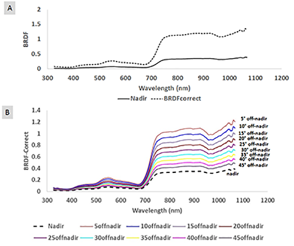 The spectral reflectance profile measured at different viewing angles presented only a difference in their magnitude, maintaining the shape and features of the spectral curve. It was also observed that the spectral profile was closer to the curve at nadir, especially the spectral profile at the 25° off-nadir, 20° off-nadir, 15° off-nadir and 5° off-nadir viewing angles (Figure 6.B). The spectral reflectance profile with off-nadir angles of 45°, 40°, 35° and 30° were also close together.