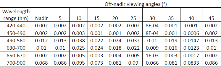 At the 30° off-nadir angle, this same behavior of decreasing the ANIF in all analyzed wavelengths can be seen, with values lower than 1, related, therefore, with forwarding scattering component. For wavelengths less than 750 nm, ANIF values less than 1 were found, as well as for the 45° off-nadir angle. From 20° off-nadir to 15° off-nadir a stability in the anisotropy factor can be seen for all wavelengths.
