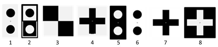 Only monochromatic targets were considered due to their higher contrast in sunlight. Black, white, and gray backgrounds were tested. The different backgrounds in targets with the same shapes enable to assess the influence of the image contrast and saturation in the target center location. Two circles were used instead of a single one to facilitate template matching application and refinement using the least squares method. A single circle limits analytical possibilities because its scale and rotation cannot be determined by least squares matching, as reported by Gruen (1996). When the image stations have good initial approximated coordinates, it is not necessary to have coded targets because they can be located by projecting the ground coordinates to the images. Nowadays, initial position can be obtained even with navigation grade GPS receivers, which provides enough accuracy for target location.