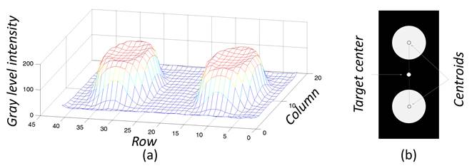 In this assessment, to minimize blurring and saturation effects, the centroid technique was applied to double circular targets. The threshold separating the circle from the background was estimated using Otsu’s method (Otsu, 1979), and the weighting was defined by subtracting the pixel intensity from the threshold (Trinder et al. 1995). The midpoint between both weighted centroids determines the center of the target (Figure 2.b). This easily implemented technique usually provides good accuracy (Trinder et al. 1995).