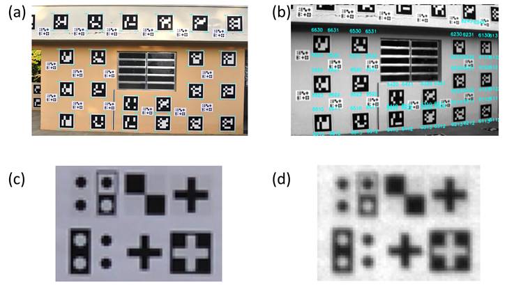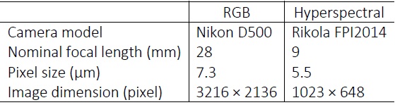 Two cameras, detailed in Table 1, were previously calibrated to acquire RGB and hyperspectral images. The interior orientation parameters (IOPs) of each camera were determined by camera self-calibration (Kenefick et al. 1972) in a terrestrial calibration field composed of automatically detected and recognized Aruco coded markers (Garrido-Jurado et al. 2014), see Figures 4(a, b).
