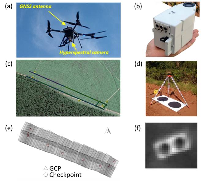 This section describes an aerial survey performed to collect hyperspectral frame images over a vegetation area and to use the target 6 as ground control point (GCP). The aerial survey was performed using a UAV platform equipped with a Rikola hyperspectral camera and GNSS receiver, shown in Figure 5.a. The hyperspectral camera (Figure 5.b) was configured to acquire image cubes with a flight height of 160 m with flying speed of 4 m/s, which generated images with a GSD of 10 cm. Two image strips were collected covering a range of 800 m over a vegetation area (with forest and sugarcane) (Figure 5.c). Before carrying out the aerial survey, five targets type 6, as shown in Figure 5.d, were geometrically positioned along the planned perimeter of the test area. Figure 5.e displays the block geometry and Figure 5.f shows an example of the target 6 appearing in one image.