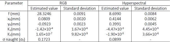 Table 2 presents the IOPs estimated by self-calibrating bundle adjustment using the collinearity model with distortion parameters from the Conrady-Brown model (Brown 1971). The decentering distortion parameters resulted in insignificant values and were removed with the calibration process being computed again with this reduced set of parameters. Both camera calibrations were calculated using the calibration with multi-cameras (CMC) software (Ruy et al. 2009). The hyperspectral camera calibration only used images of the 680 nm spectral band near the central spectrum because the other bands could be registered with respect to this reference band.