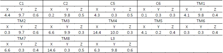 Table 4 presents the RMSEs, indicating that the best results (RMSE ≤ 0.3 cm in X and Y and RMSE ≤0.4 cm in Z) were obtained for the centroid (C6) and the template matching (TM6) techniques with target type 6. Their RMSEs were low and with small relative variation among the three coordinates (the other techniques produced larger differences among the XYZ coordinates). When using weighted centroids with target 6, the results were consistently suitable both in the image (Table 3) and in the object spaces (Table 4).