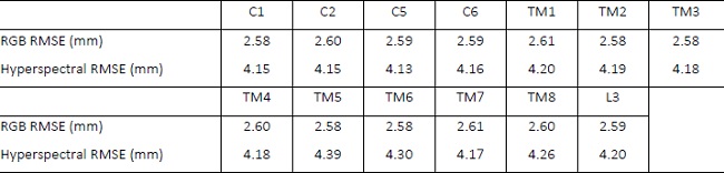 Table 6 presents the RMSE of the control distances for both RGB and hyperspectral triplets. Similar RMSEs (2.58-2.6 mm) were obtained with the RBG triplet for all types of targets and all three techniques. With the hyperspectral triplet, larger RMSEs were obtained (4.13 4.39 mm) due to the higher GSDhyp compared to that of the RGB camera. The largest discrepancies (> 4.25 mm) were obtained for the template matching technique with targets type TM5, TM6 and TM8. The line intersection (L3) technique gave an intermediate RMSE (4.20 mm) while the centroid technique provided the best results, which was similar across all four assessed targets (4.13-4.16 mm).