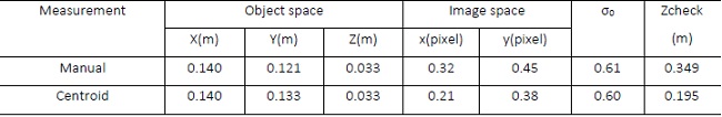One of the advantages in using targets is the automatic center location to achieve a better precision. Thus, the target center measurement was also performed manually (with point transfer by LSM) for comparison of the results achieved with BBA. Table 7 presents the RMSE at five GCPs resulting from the BBA considering both manual and automatic (centroid) measurements. Similar RMSEs were obtained between the techniques in the object coordinates of the GCPs, as well as the σ0 of each technique was also similar.
