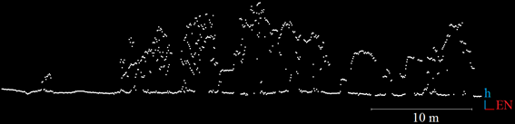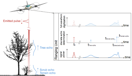 Figure 1 illustrates difference between the measurement of discrete echoes and the full-waveform recording. In the discrete form system detects the time when the returned signal is greater than a threshold, and therefore it produces just two measurements in the example. The first return corresponds to the tree and the second one is the result of the mixture of the reflection of the scrub and the terrain. In the full-waveform digitization, the complete return signal is recorded at discrete times.