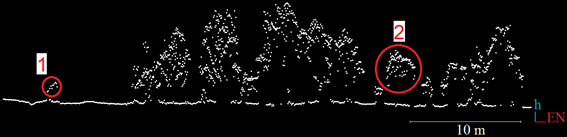 Figures 9 and 10 illustrate the points of the first strip (L1) computed with the DDR software and the GA method, respectively. The GA points cloud is denser, with around 23 % more points. Two regions are outlined with red circles in Figure 10. In areas with low vegetation (region 1), there was no significant increase of points. In the second region, a region covered by high vegetation, it can be seen that there was a significant increase of points. In order to confirm the results obtained in the areas of high vegetation, another study area was chosen with predominance of high and dense vegetation, again more points were obtained that were generated with DDR software. The increase in the number of points was approximately 28 %.
