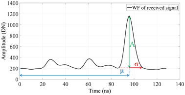 A common practice to model each peak (j) is based on the assumption that a single return is symmetric and follows a Gaussian distribution (Wagner et al. 2006). Under this assumption, three parameters are sufficient to reconstruct the reflected signal of a single surface: the mean (μj ), amplitude (Aj ) and standard deviation (σj ). These parameters correspond to the mean time of the peak, height and width of the base in abscissa axis. Equation 1 shows the Gaussian function (fG,j ) for each time (xj ). Figure 2 shows the Gaussian parameters (μ, A, σ) for the last peak in the WF of received signal.